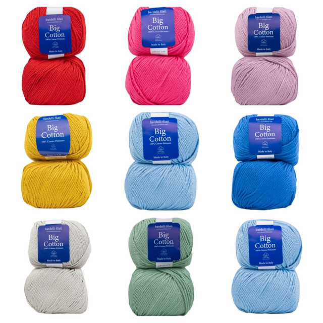 Cotone Big Cotton è un tipo di filato per magliette perfetto anche per accessori con cui decorare la casa, come tappeti o cuscini, e accessori come collane, bracciali, borse e molto altro.